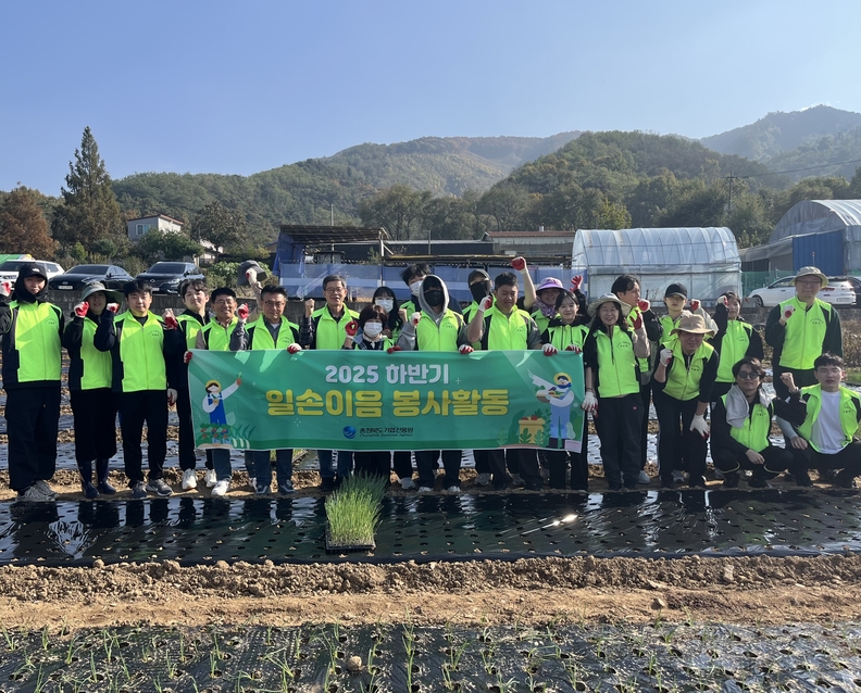 충북기업진흥원 직원들이 지난 7일 청주 내수읍 양파농가에서 일손 봉사활동을 하고 기념촬영하고 있다.