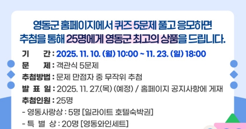 영동군이 제66회 인터넷정보검색대회를 개최한다. 11월 10일부터 23일까지 영동군청 홈페이지에서 객관식 5문제를 풀고 응모하면, 추첨을 통해 총 25명에게 일라이트 호텔 숙박권과 영동 와인세트 등 지역 특산품이 증정된다.