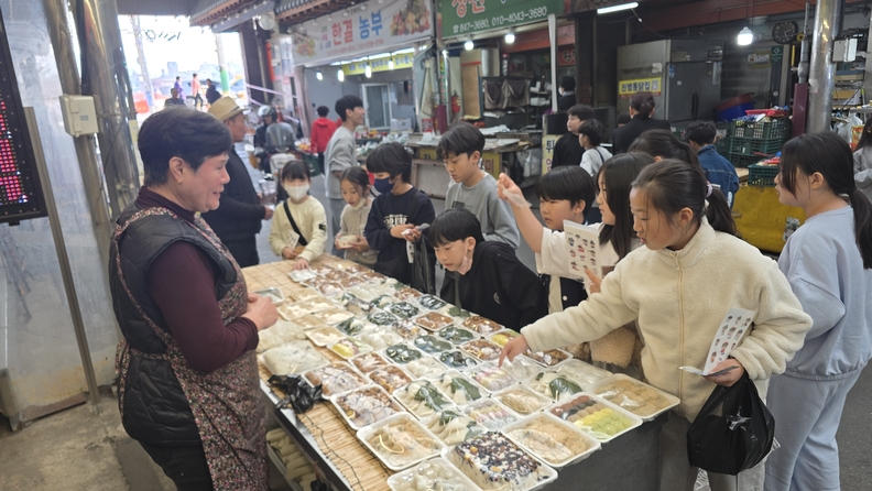 중앙탑초 학생들이 전통시장 체험을 하고 있다.