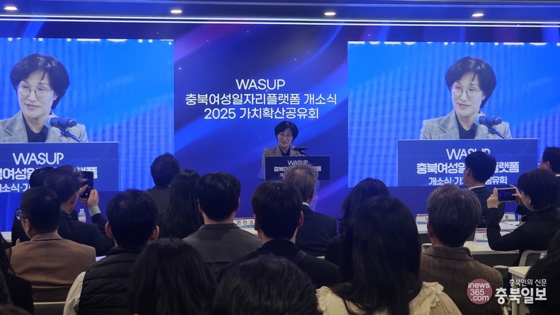원민경 성평등가족부 장관이 10일 열린 'WASUP충북여성일자리플랫폼'개소식에서 축사를 하고 있다.