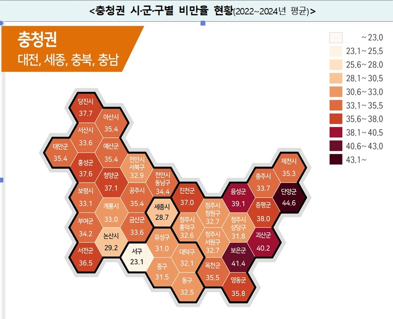 충청권 시군구별 비만율(2022~2024년 평균) 현황. 충북 단양군(44.6%)이 가장 높았으며, 보은군(41.4%)이 도내 2위이자 전국 3위로 나타났다. 영동군(35.8%)과 옥천군(35.5%) 역시 전국 평균(34.4%)을 웃돌았다.