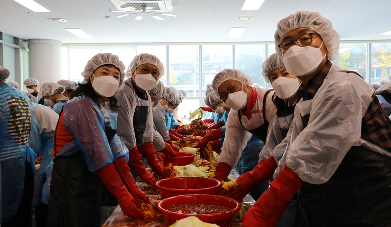 서원대학교 구성원들이 11일 청주시 서원노인복지관에서 김장 나눔 봉사를 한 뒤 환화게 웃고 있다.