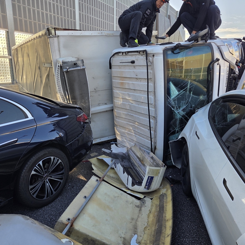 중부고속도로 동서울방향 강서하이패스IC 인근에서 A씨(46)가 몰던 2.5화물차가 앞서가던 1t 화물차와 방음벽을 들이받았다.