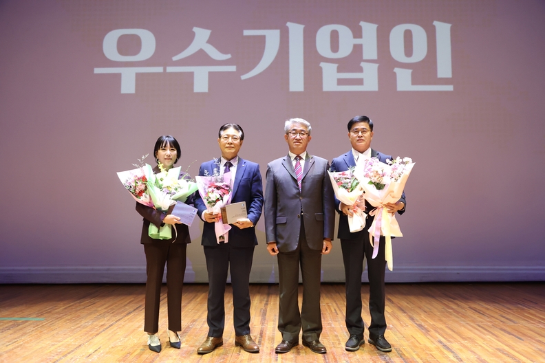 충주기업의 날 기념행사에서 우수기업인들이 표창을 받으며 기념사진을 찍고 있다.