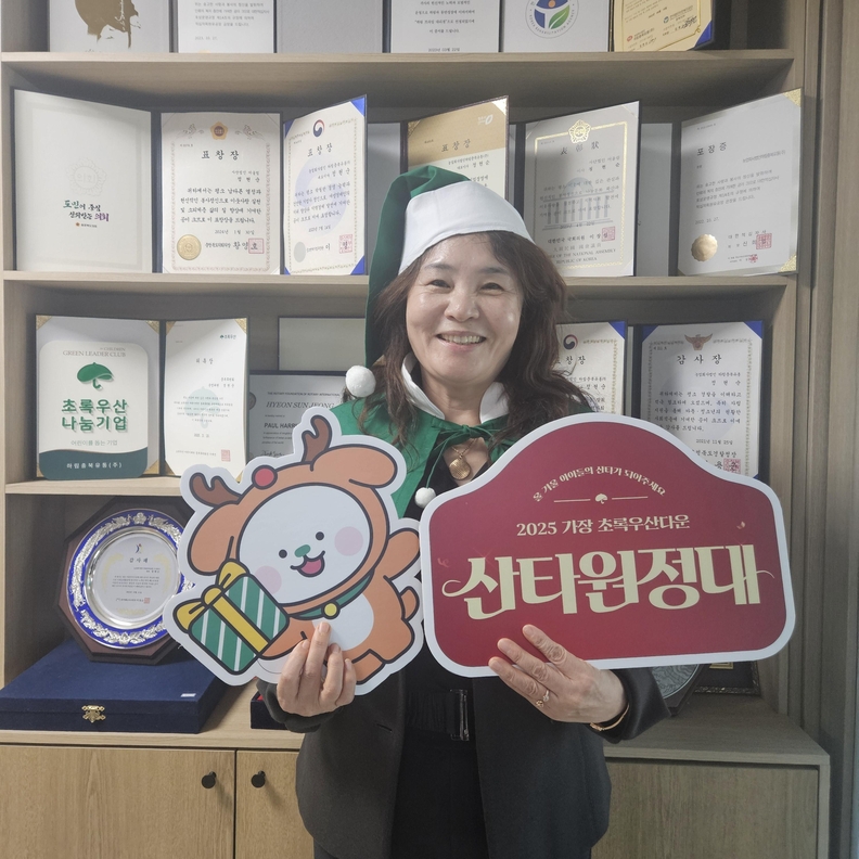 정현순 하림충북유통㈜ 대표가 산타로 분장해 초록우산 충북지역본부의 '2025 산타원정대' 캠페인 참여를 독려하고 있다.