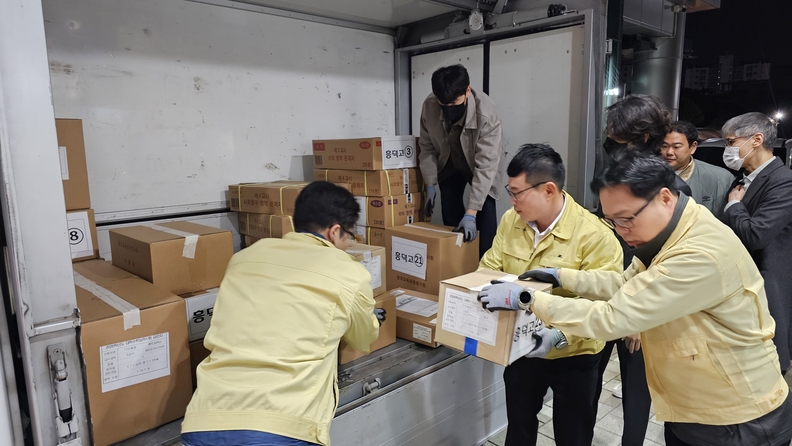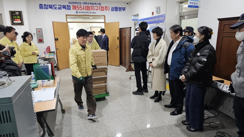 [충북일보] 2026학년도 대학수학능력시험인 13일 새벽 55시험지구 상황본부인 청주교육지원청에 보관 중이던 수능 문제지와 답안지가 청주지역 17개교에 마련된 시험장으로 이송되고 있다. 도내 응시인원은 1만3천890명으로 2025학년도 수능 대비 1천233명이 증가했다. 사진제공= 충북도교육청