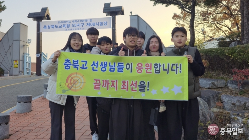 충북고 교사들이 13일 청주대성고 앞에서 제자들을 응원하고 있다.