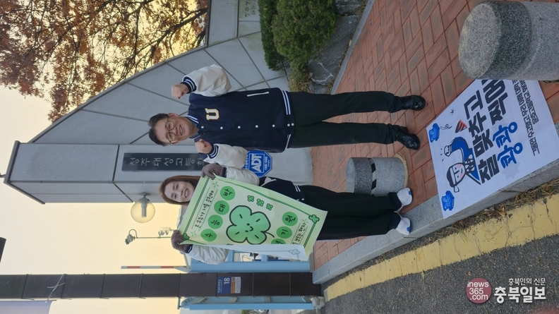 운호고 교사들이 13일 청주대성고 앞에서 제자들을 응원하고 있다.