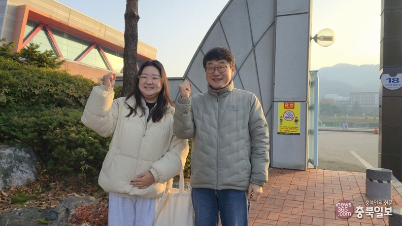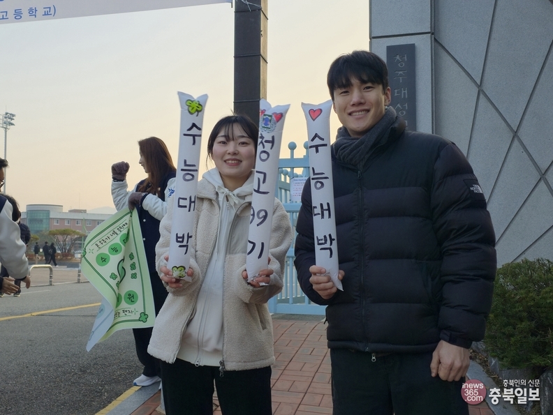 청주고 교사들이 13일 청주대성고 앞에서 제자들을 응원하고 있다.