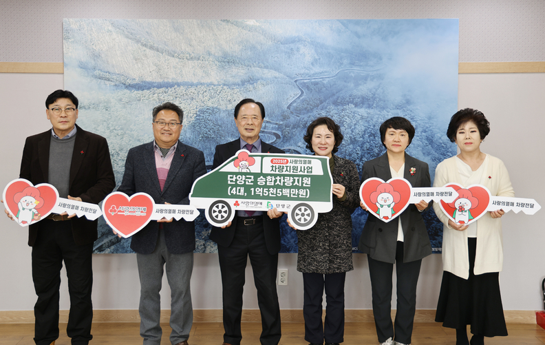 충북사회복지공동모금회 이민성 모금회장과 관계들이 단양군을 찾아 1억5천500만원 상당의 승합차 구매비를 전달하고 있다.
