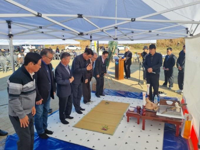 음성군 감곡면파크골프협의회(회장 정용훈)가 지난 12일 감곡면 청미천변 일원에서 감곡 파크골프장 조성사업 착공에 따른 안전기원제를 열고 있다.
