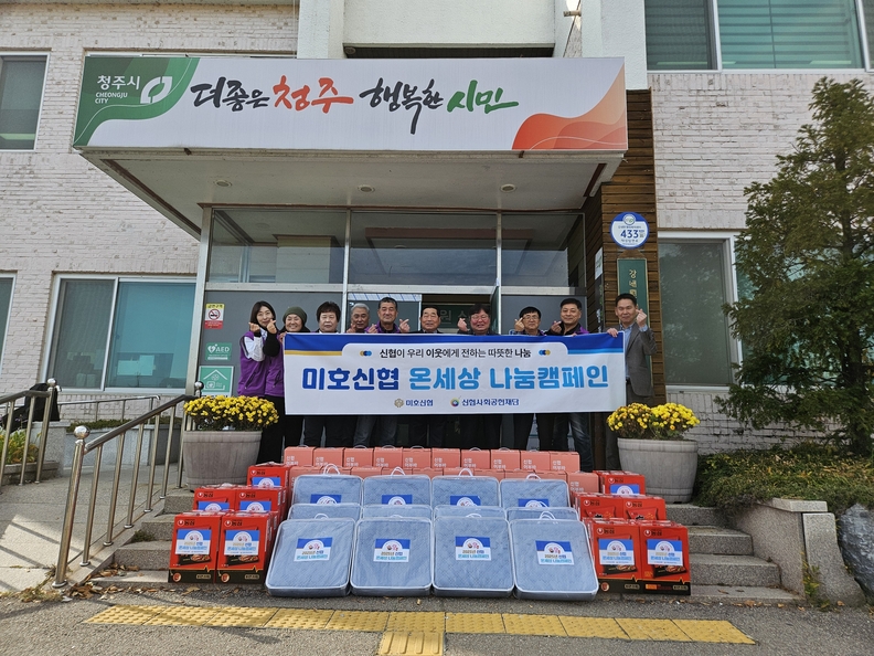 청주 미호신협이 최근 취약계층의 겨울나기를 지원하기 위해 어부바박스 등을 기부한 가운데 청주시 흥덕구 강내면 직원 등과 기념사진을 찍고 있다.