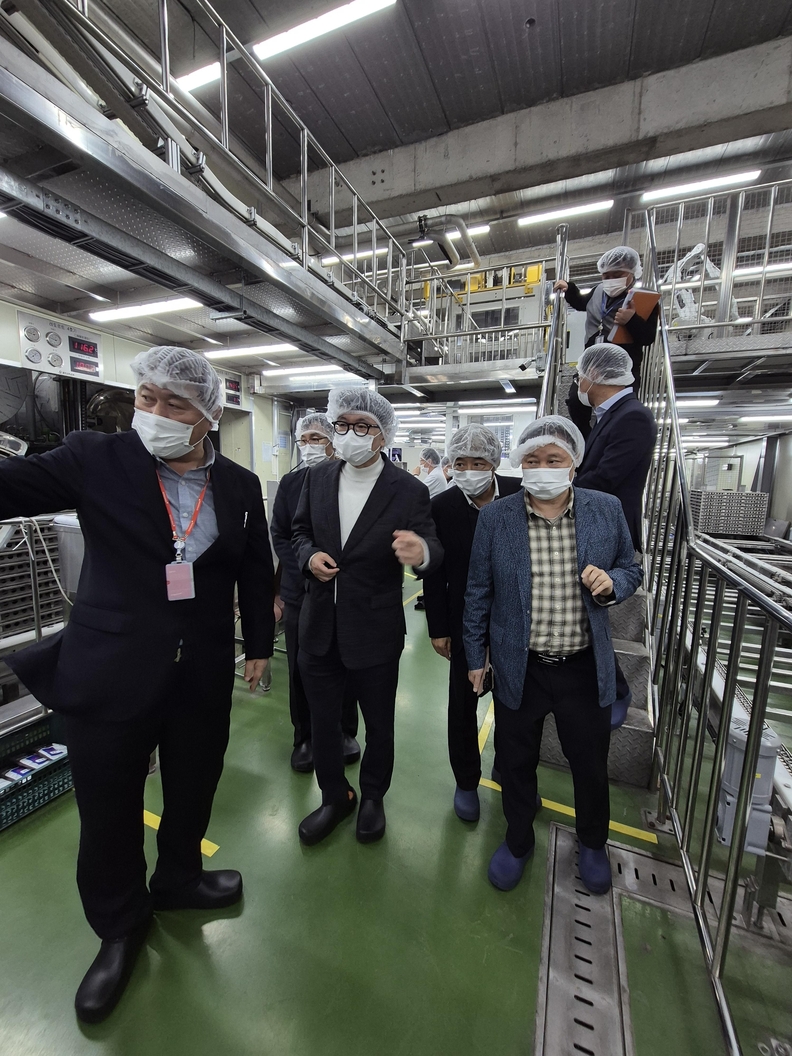 충북중기청과 충북과학기술혁신원, 제이앤씨시스템즈 관계자들이 옥천에 소재한 (주)교동식품을 방문해 현장을 둘러보고 있다.