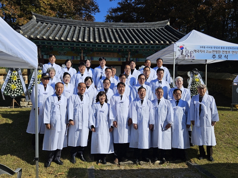 충북북부보훈지청과 광복회 관계자 등이 애국지사 연병환·연병호·연미당 선생 추모식에 참여하며 단체사진을 찍고 있다.