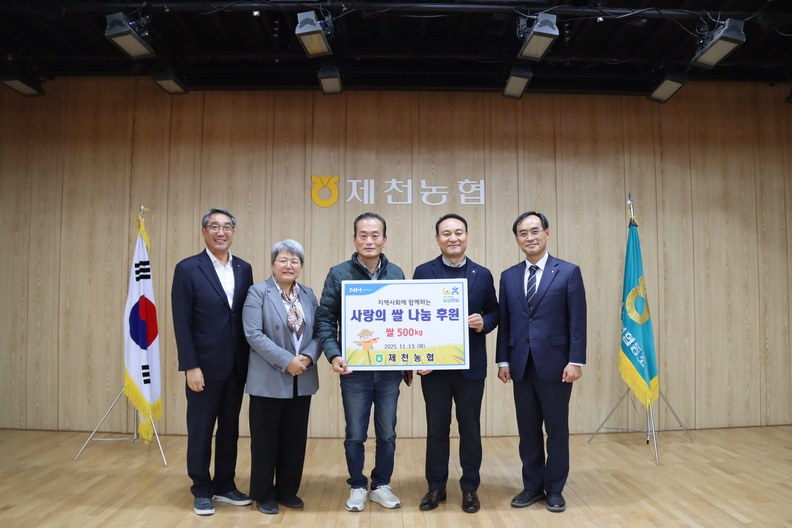 제천농협과 NH농협 제천시지부 관계자가 (사)제천시 장애인단체연합회에 총 500㎏의 햅쌀을 전달하고 있다.