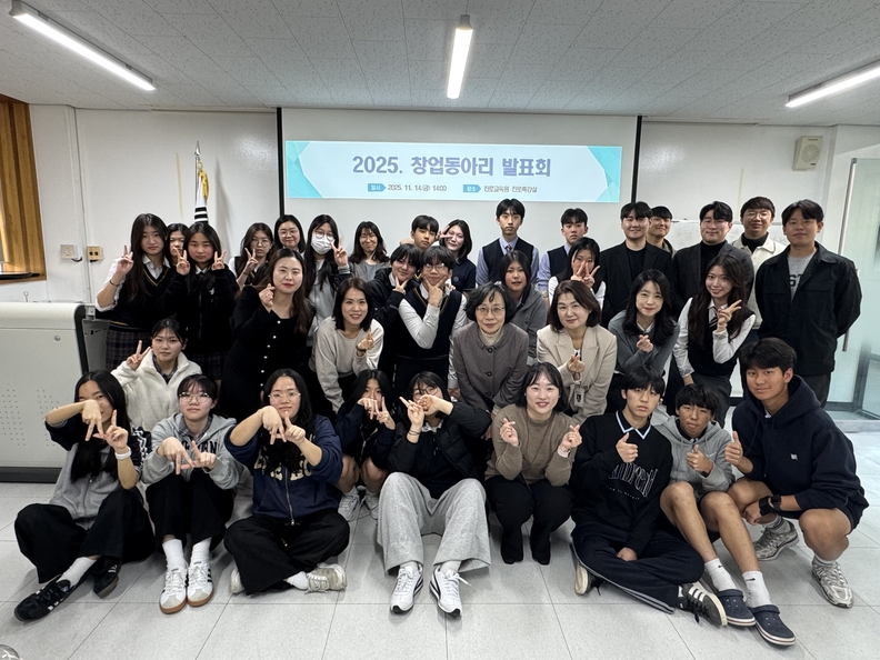 지난 14일 충북진로교육원 진로특강실에서 열린 창업동아리 발표회에서 참가 학생 등이 창업체험활동을 공유한 뒤 기념사진을 남기고 있다.