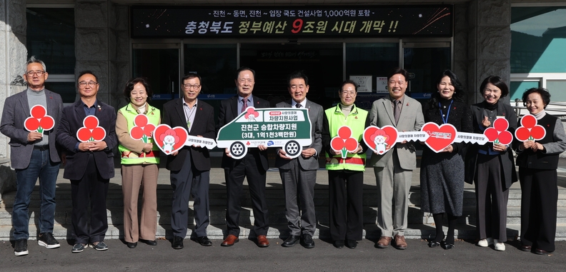 충북사회복지공동모금회가 17일 진천지역 사회복지기관 지원을 위한 차량전달식을 진행하고 있다.