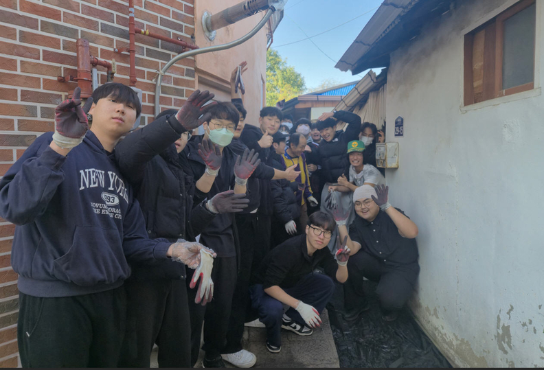 충주 대원고 학생들이 연탄 나눔 봉사를 하며 사진촬영을 하고 있다.