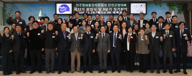 22기 민주평화통일자문회의 진천군협의회 자문위원들이 18일 진천군청 대회의실에서 진행된 출범식에 참석해 단체사진 촬영을 하고 있다.