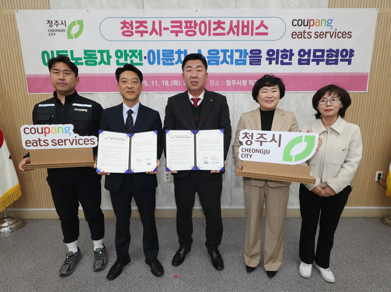 이범석(가운데) 청주시장과 쿠팡이츠 관계자들이 업무협약을 한 뒤 기념촬영을 하고 있다.