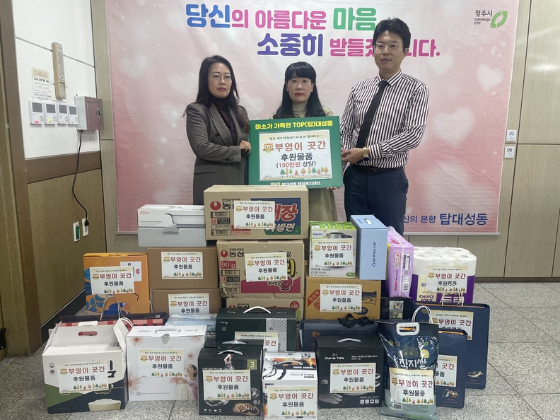 청주시 탑동센트럴힐데스하임 입주민들이 탑대성동 행정복지센터에 100만원 상당의 후원물품을 기탁하고 기념촬영을 하고 있다.