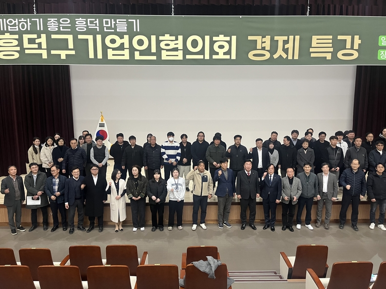 이범석 청주시장, 전정희 흥덕구기업인협의회장 등 '청주시 흥덕구기업인협의회 경제특강' 참석자들이 지역 기업 발전을 다짐하는 파이팅을 외치고 있다.