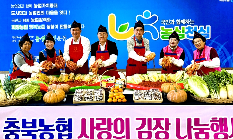 (왼쪽 두 번째부터) 이상경 회장, 이용선 총괄본부장, 임세빈 농협은행 충북본부장, 김영준 충북농협 노조위원장, 이한자 회장이 여성 조직 회원들과 김장을 시연하고 있다.