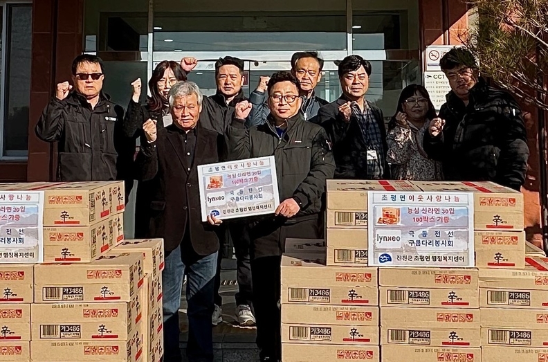 [충북일보] 진천 초평면의 극동전선㈜ 강재수(앞줄 오른쪽) 구름다리봉사회장이 18일 초평면사무소를 찾아 취약계층에게 전달해 달라며 200만 원 상당의 라면 100박스를 김영수(앞줄 왼쪽) 초평면지역사회보장협의체 민간위원장에게 기탁하고 있다.