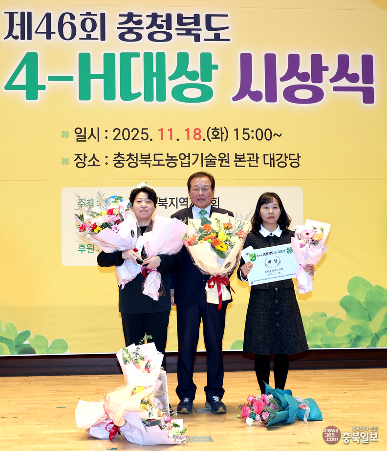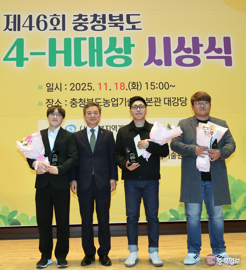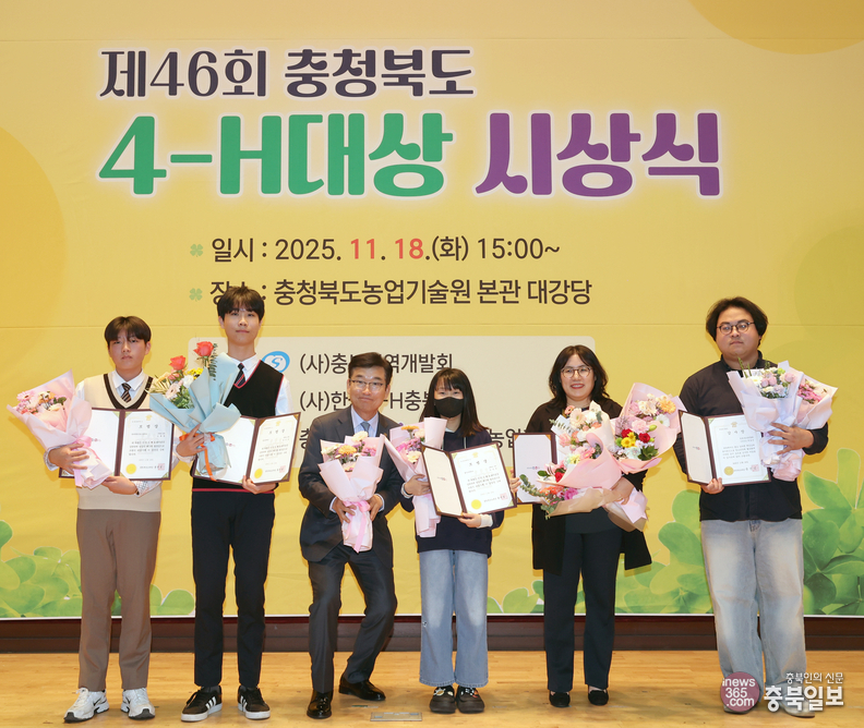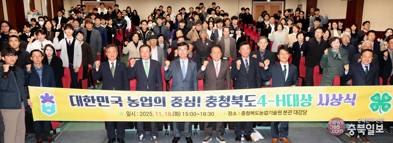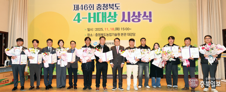 18일 충북도농업기술원에서 열린 46회 충청북도 4-H대상 시상식에서 김영환 충북지사, 윤건영 도교육감, 오선교 충북지역개발회 회장, 연경환 본보 대표와 참석자들이 기념촬영을 하고 있다.