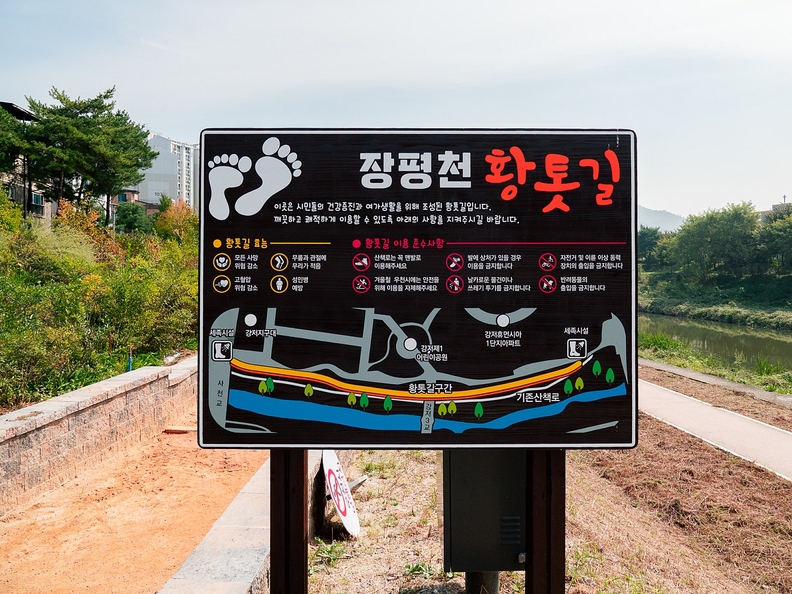 장평천 황톳길은 폭 2m, 길이 340m 규모로, 강저 제1어린이공원 인도교(강저3교) 인근에서 찾아볼 수 있다.