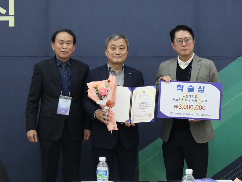 극동대 탁송수(사진 가운데) 수소안전학과 교수가 '2025년도 3회 KCI 산업진흥연구 학술상'을 수상하고 있다.