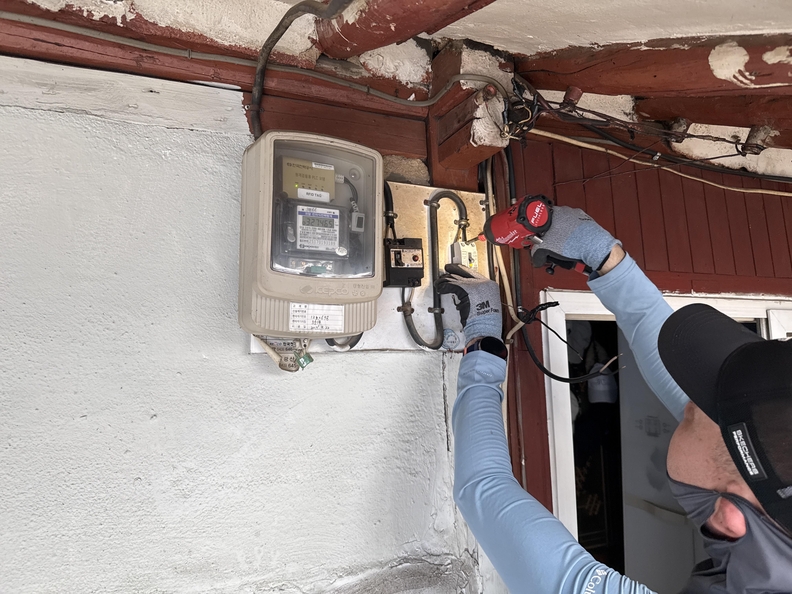 제천시 중앙동 지역사회보장협의체 위원이 취약계층 노후주택 전기시설을 점검, 수리하고 있다.