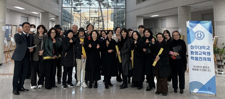 청주대학교 평생교육원 수강생들이 평생교육원 1층 로비에서 열린 작품전시회에서 단체사진을 찍고 있다.
