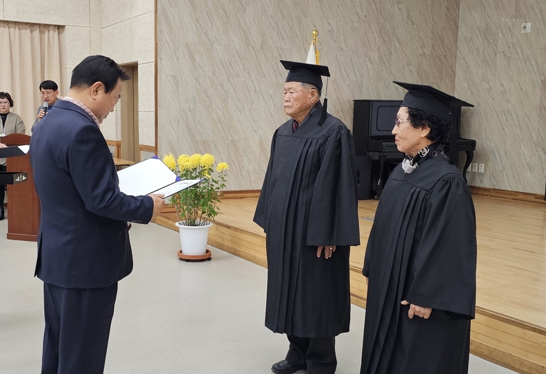 영동군노인대학(대학장 차광식)은 3일 영동노인복지관 대회의실에서 제41기 졸업식을 개최하고 총 57명의 졸업생을 배출했다고 밝혔다. 사진은 면학상을 받은 88세 송병인, 김연옥 어르신.