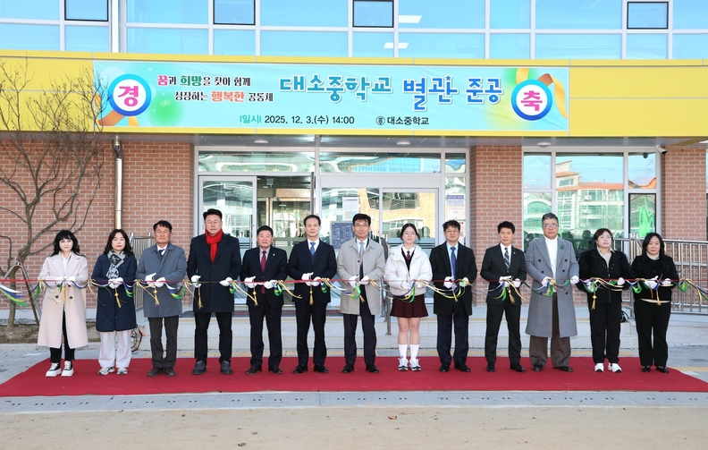 3일 열린 음성 대소중학교 별관 준공식에서 참석자들이 테이프 컷팅을 하고 있다.