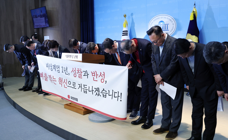 국민의힘 이성권, 김용태 등 의원들이 3일 서울 여의도 국회 소통관에서 12.3 비상계엄 관련 입장 발표 기자회견을 열고 허리 숙여 사과하고 있다.