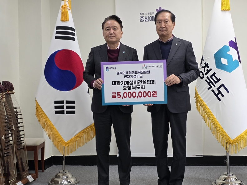 양승복(오른쪽) 대한기계설비건설협회 충북도회장이 3일 충북인재평생교육진흥원에 장학금 500만 원을 전달하고 있다.