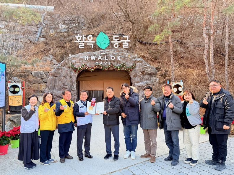 충주 활옥동굴 관계자들이 대한적십자로부터 유공장 금장을 수상하며 단체사지을 찍고 있다.