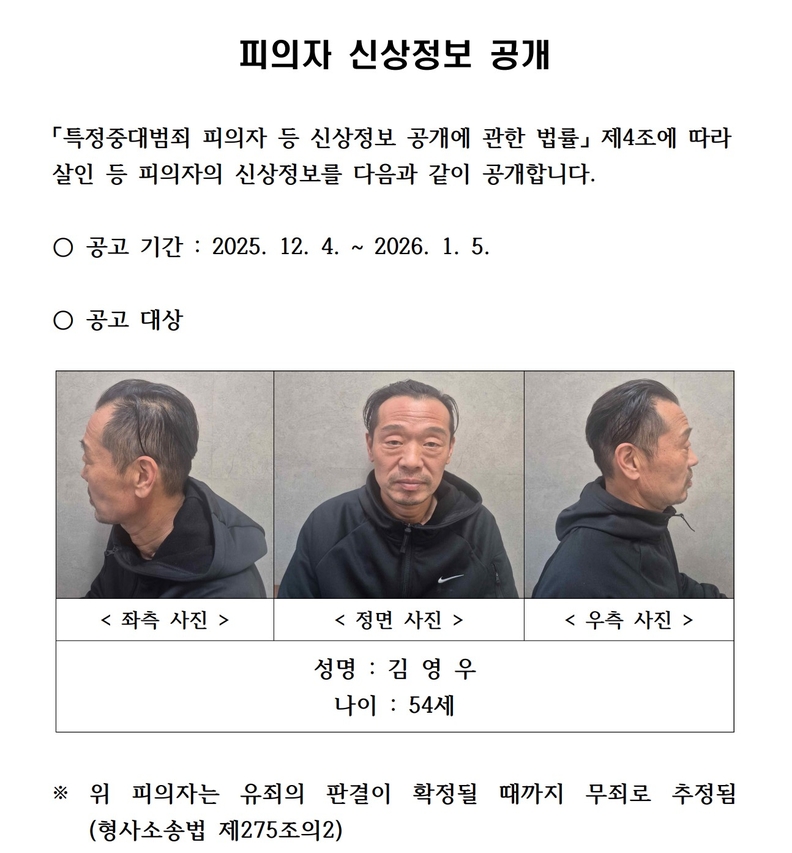 김씨의 신상은 오는 2026년 1월 5일까지 30일간 게시된다. 도내에서 범죄자 신상 정보가 공개된 건 이번이 처음이다.