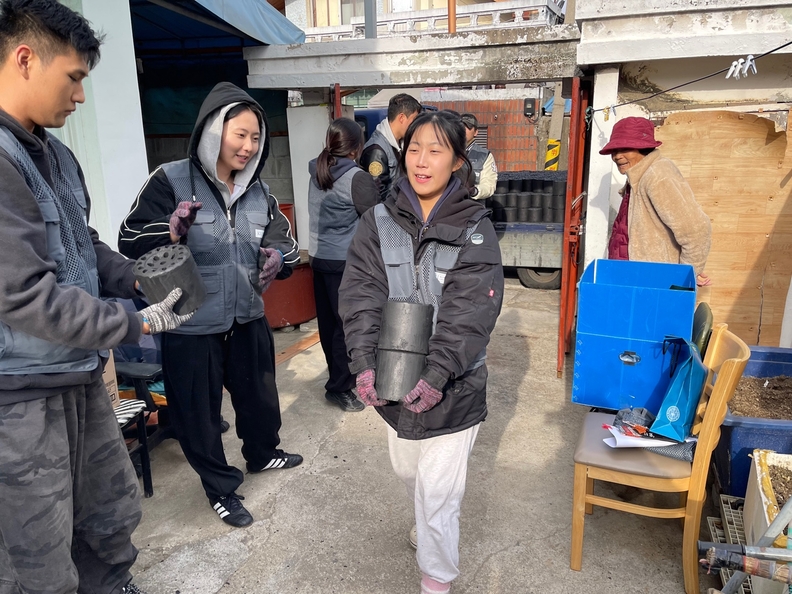 건국대 글로컬캠퍼스 학생들이 연탄 나눔 봉사활동을 벌이고 있다.