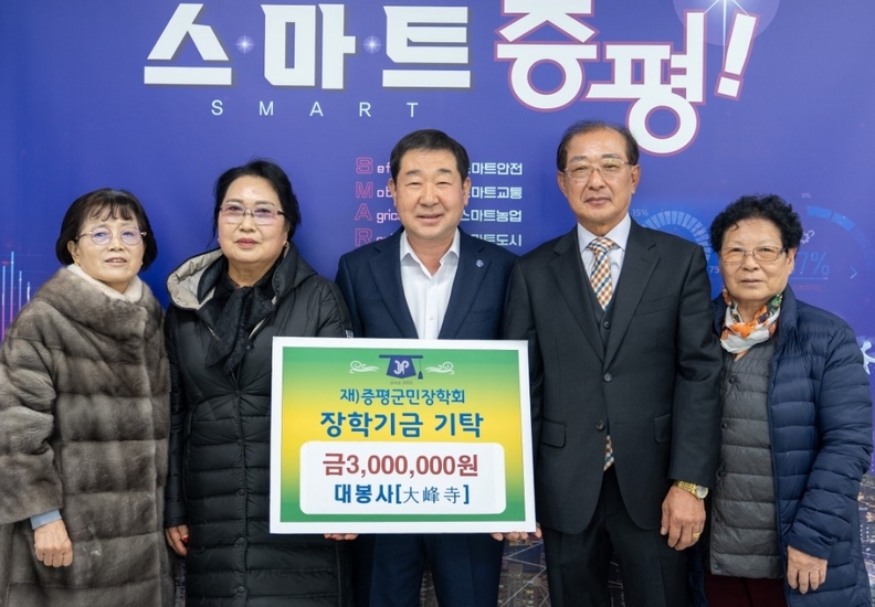 [충북일보] 증평 대봉사(大奉寺) 신도들이 4일 증평군청을 찾아 지역 우수인재 양성을 위해 써달라며 이재영(가운데) 군수에게 장학금 300만 원을 기탁하고 있다.