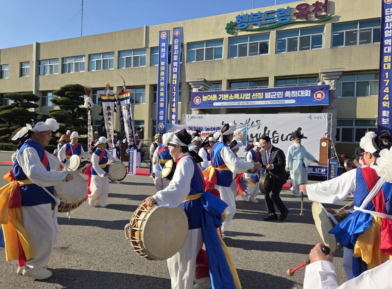 농어촌기본소득 선정 축하 공연이 군청 앞마당을 뜨겁게 달궜다. 4일 열린 범군민 축하대회에서 청산면민속보존회 풍물패와 황규철 군수, 지역민이 함께 어울리며 축제 분위기를 끌어올리고 있다.