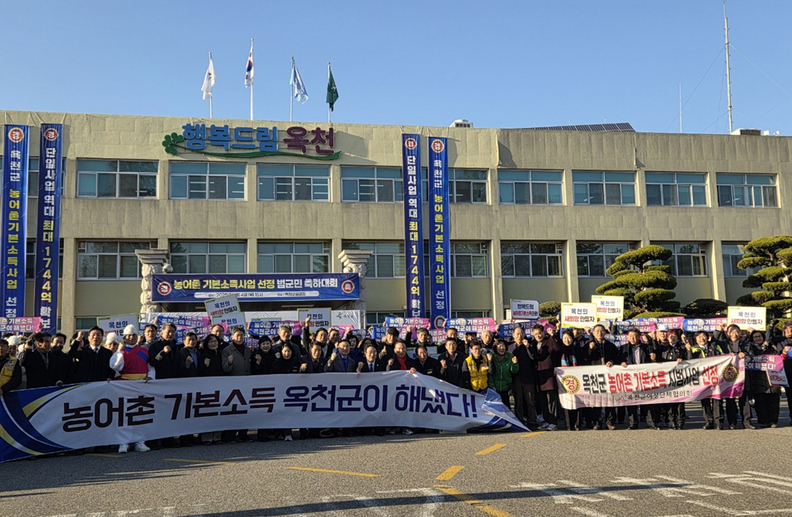 옥천군청 전면을 가득 채운 축하 현수막과 피켓. 범군민 축하대회 참석자들이 ‘농어촌기본소득 옥천군이 해냈다’ 대형 플래카드와 함께 기념 촬영을 하고 있다.