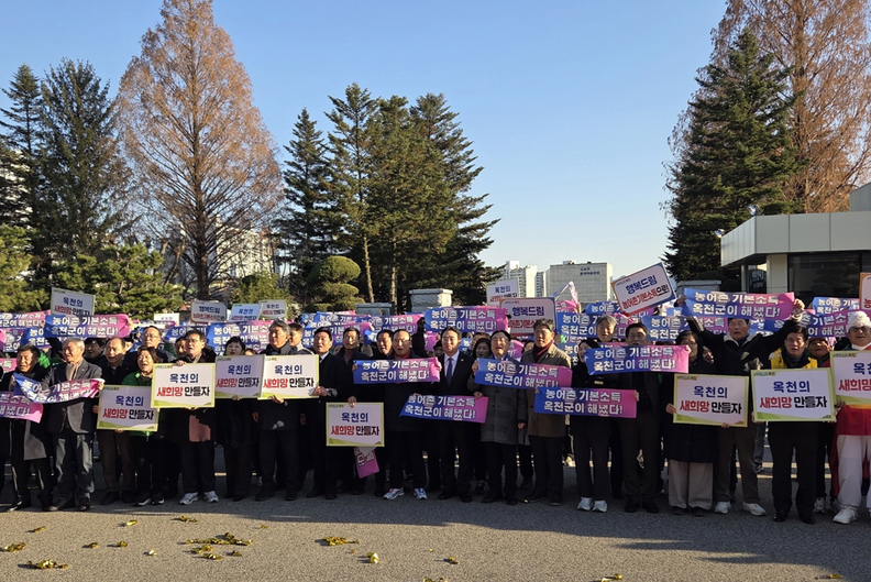지역민들이 ‘옥천군이 해냈다’는 문구의 피켓을 들고 농어촌기본소득 선정의 기쁨을 함께하고 있다. 이날 군청 광장에는 주민·단체·기관 관계자 등 수백 명이 모여 추가 선정의 기쁨을 모두가 함께 나눴다.