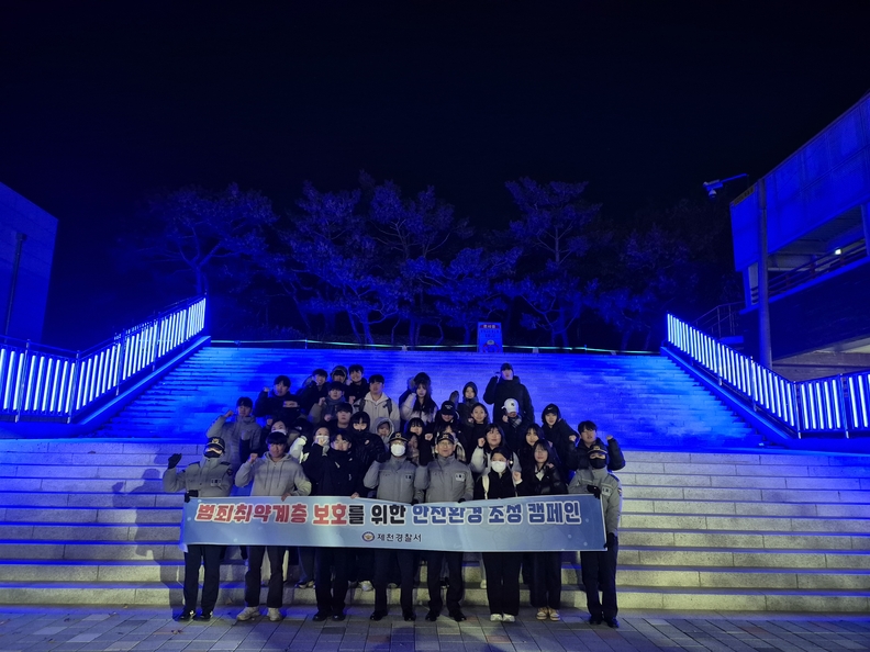 제천경찰서와 세명대학교 경찰학과 학생들이 청전동 일원에서 범죄 취약계층 보호 캠페인을 벌이고 있다.