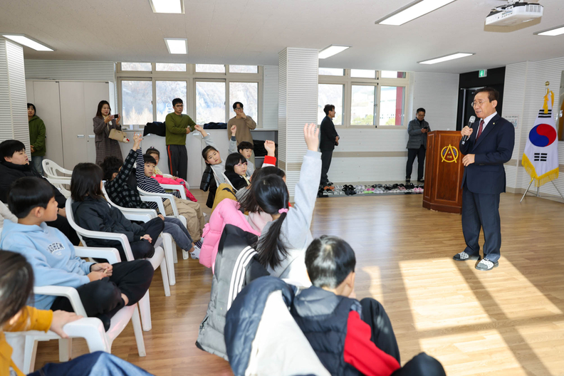 김문근 단양군수가 가곡초 학생들에게 '꿈과 열정'을 주제로 특별 강연을 펼치며 소통하고 있다.