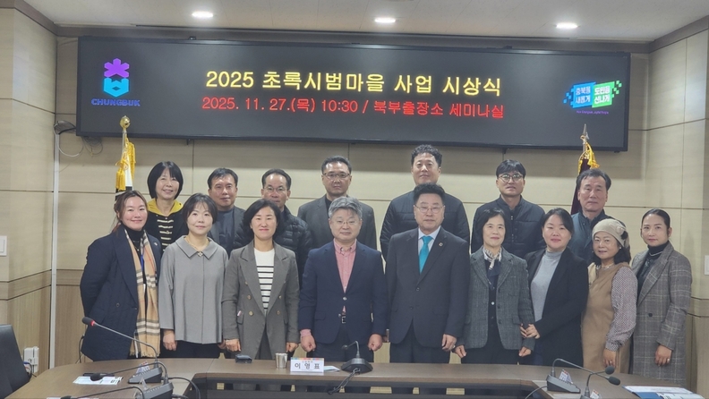 제천시 '2025 초록시범마을 시상식' 수상자들이 단체로 기념촬영을 하고 있다.