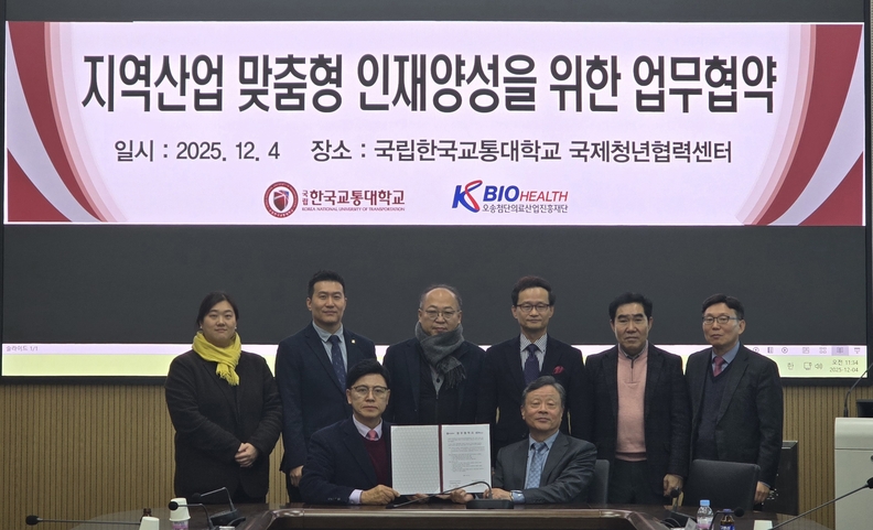 이명수(하단 왼쪽) KBIOHealth 이사장, 연익준 국립한국교통대학교 미래융합대학 학장과 관계자들이 업무협약을 체결하고 기념촬영하고 있다.