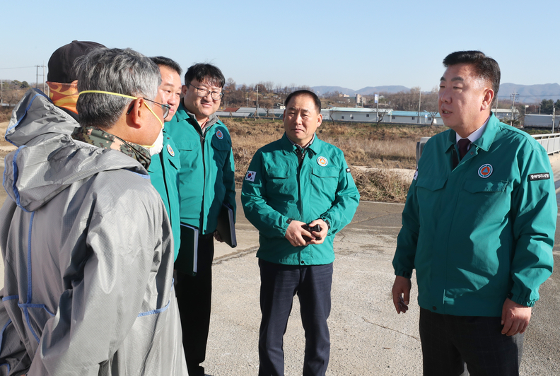 이범석(오른쪽) 청주시장이 4일 고병원성 조류인플루엔자(AI) 방역 현장을 방문해 점검하고 있다.