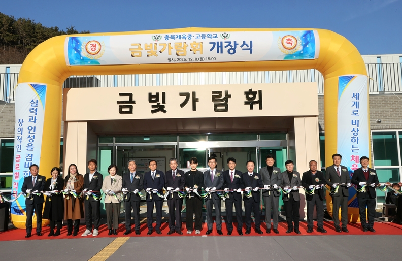 8일 충북체육중·고등학교 신축 수영장 금빛가람휘 개장식이 열린 가운데 참석자들이 개장을 축하하며 오색줄을 자르고 있다.